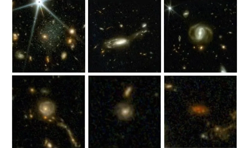 Các thiên hà từ bản đồ COSMOS-Web với niên đại khác nhau: (từ góc trên bên trái xuống góc dưới bên phải) vũ trụ hiện tại và 3 tỷ, 4 tỷ, 8 tỷ, 9 tỷ, 10 tỷ năm trước. Ảnh: M. Franco/C. Casey/COSMOS-Web