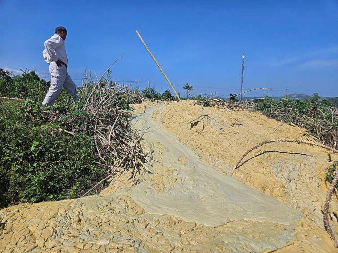 Sau 3 ngày khảo sát, cơ quan chức năng xác định bùn có màu vàng nhạt (khi khô có ánh xám trắng) tự trào ra tại vị trí đỉnh đồi với tốc độ chậm, khoảng 5 m3 mỗi ngày, khi đủ lượng sẽ chảy thành dòng ra ngoài.