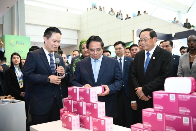 Thủ tướng Phạm Minh Chính xem một chiếc loa báo chuyển khoản tại gian hàng của MoMo trong sự kiện P4G 2025. Ảnh: Như Ý