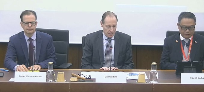 Ông Sacha Wunsch-Vincent (trái) cùng ông Carsten Fink, Kinh tế trưởng của WIPO (giữa) điều hành Hội thảo. Ảnh chụp màn hình