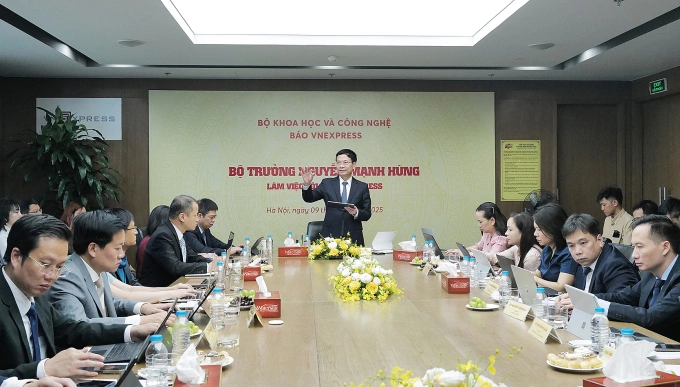 Bộ trưởng Khoa học và Công nghệ Nguyễn Mạnh Hùng làm việc tại báo VnExpress ngày 9/7. Ảnh: Ngọc Thành